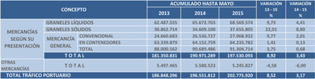 El tráfico total en los puertos españoles aumentó un 3,4% hasta mayo a pesar de que la carga general sólo creció un 0,7%, por el descenso de los contenedores en tránsito