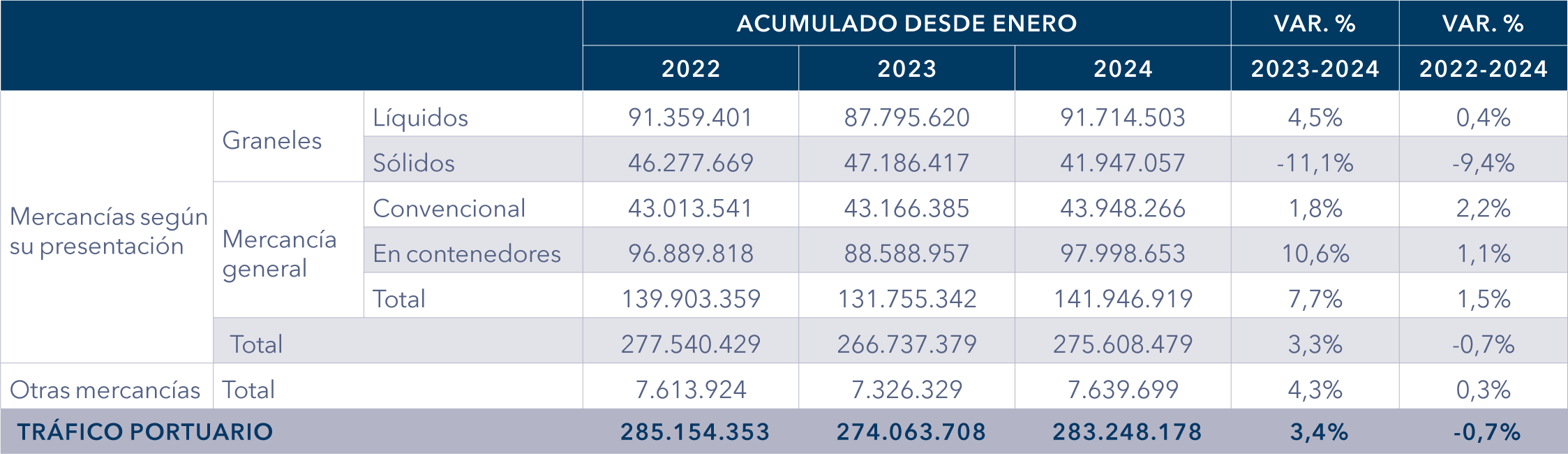 La mercancía general convencional creció un 1,8% para sumar 43,9 Mt, y la transportada en contenedores lo hizo un 10,6% hasta 98,0 Mt. Este segmento también se beneficia del crecimiento de los productos químicos movidos en contenedor, que creció un 21,7% y sumó 12,7 Mt.