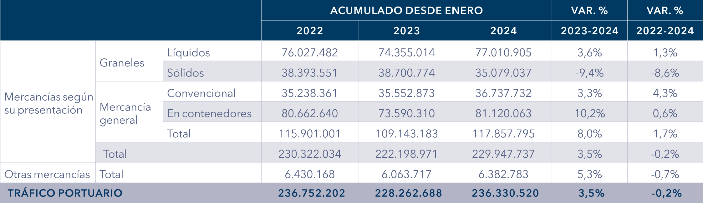 En cuanto al comercio exterior, destaca el repunte de la importaciones (84,2 Mt; +4,3%), debido al crecimiento de todas las partidas: los graneles líquidos (44,8 Mt; +2,6%), los graneles sólidos (22,6 Mt; +7,8%) y la mercancía general (16,8 Mt; +4,5%).